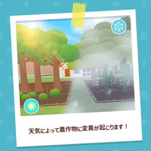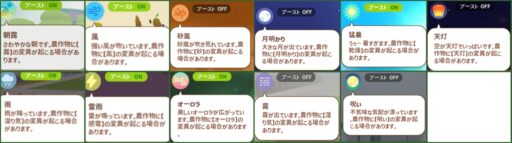 ホームタウンの天候はランダムに変化します。天候が変わっている間、作物の変異が確率的に起きます。また、作物を収穫せずに放置しておけば複数の天候変異がつく可能性が高まります。