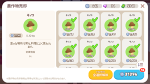 コインが 800枚貯まったら、一度きりの作物「キノコ」を買い、収穫・売却を続けると稼げる速度が上がります。