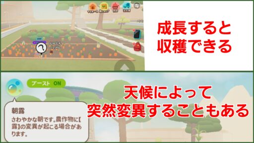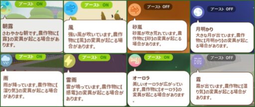 ホームタウンの天気はランダムに変化し、変異を起こす天候は 5分間続きます。天候が変わっている間、作物の変異を起こすことがあります。 公式では「天候変異」と呼んでいます。