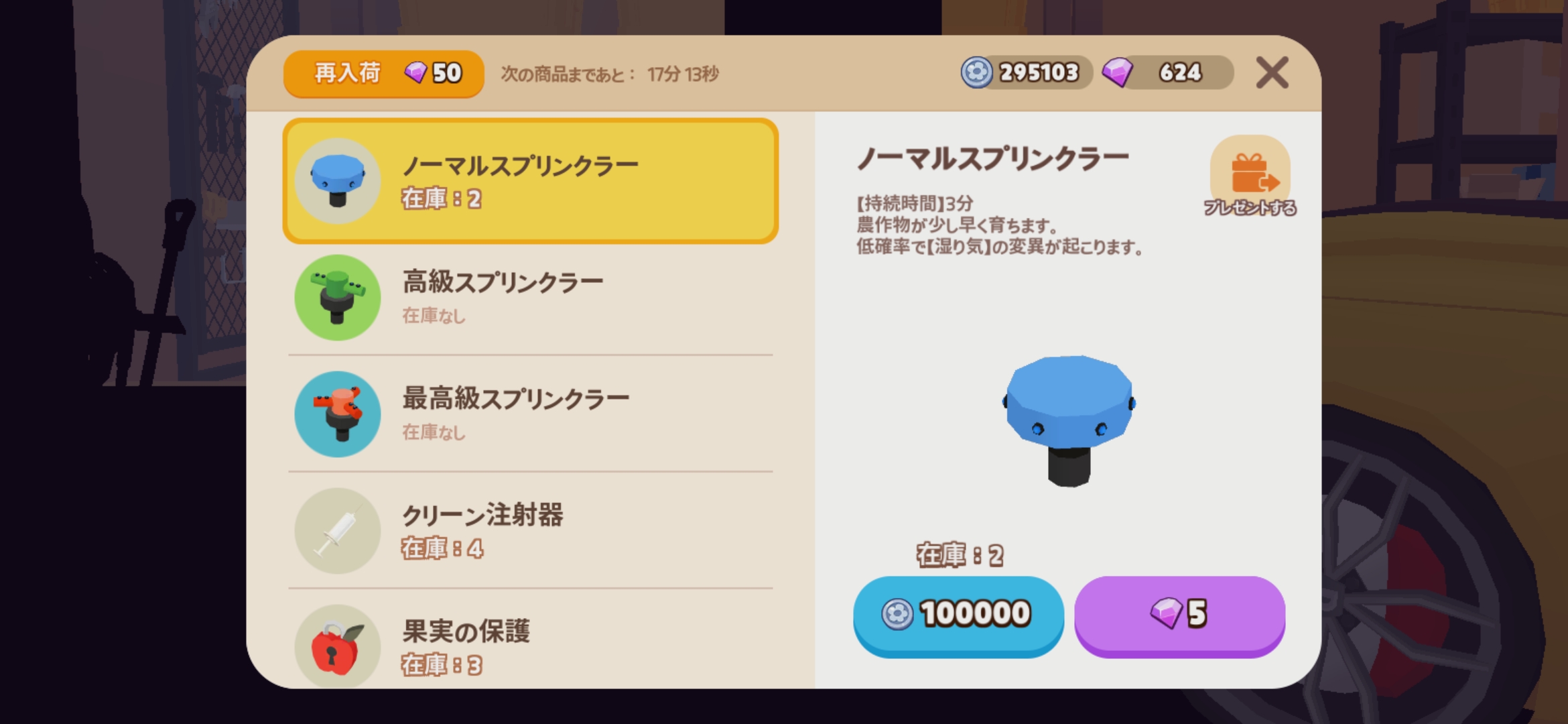 ![]() ノーマルスプリンクラー | 100,000 | 5 | ・農作物が少し早く育つ ・【湿り気】の変異が出る場合がある |
