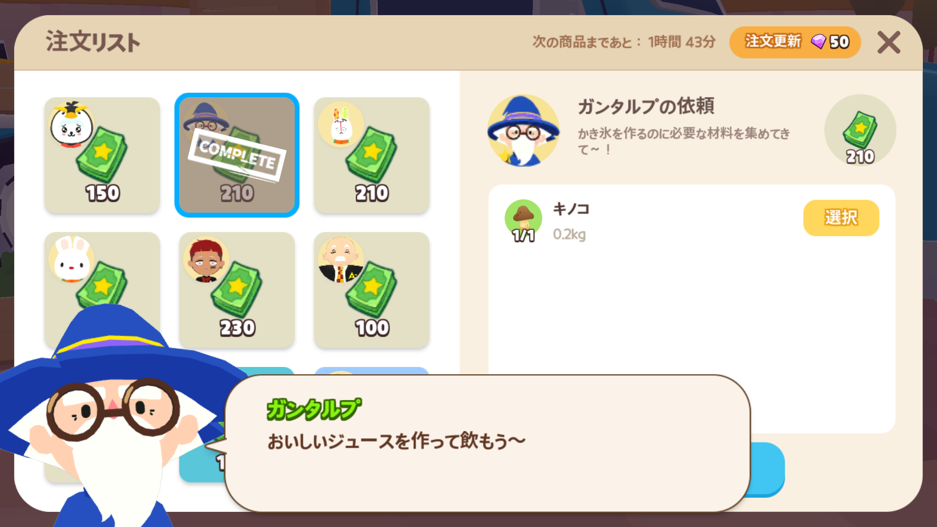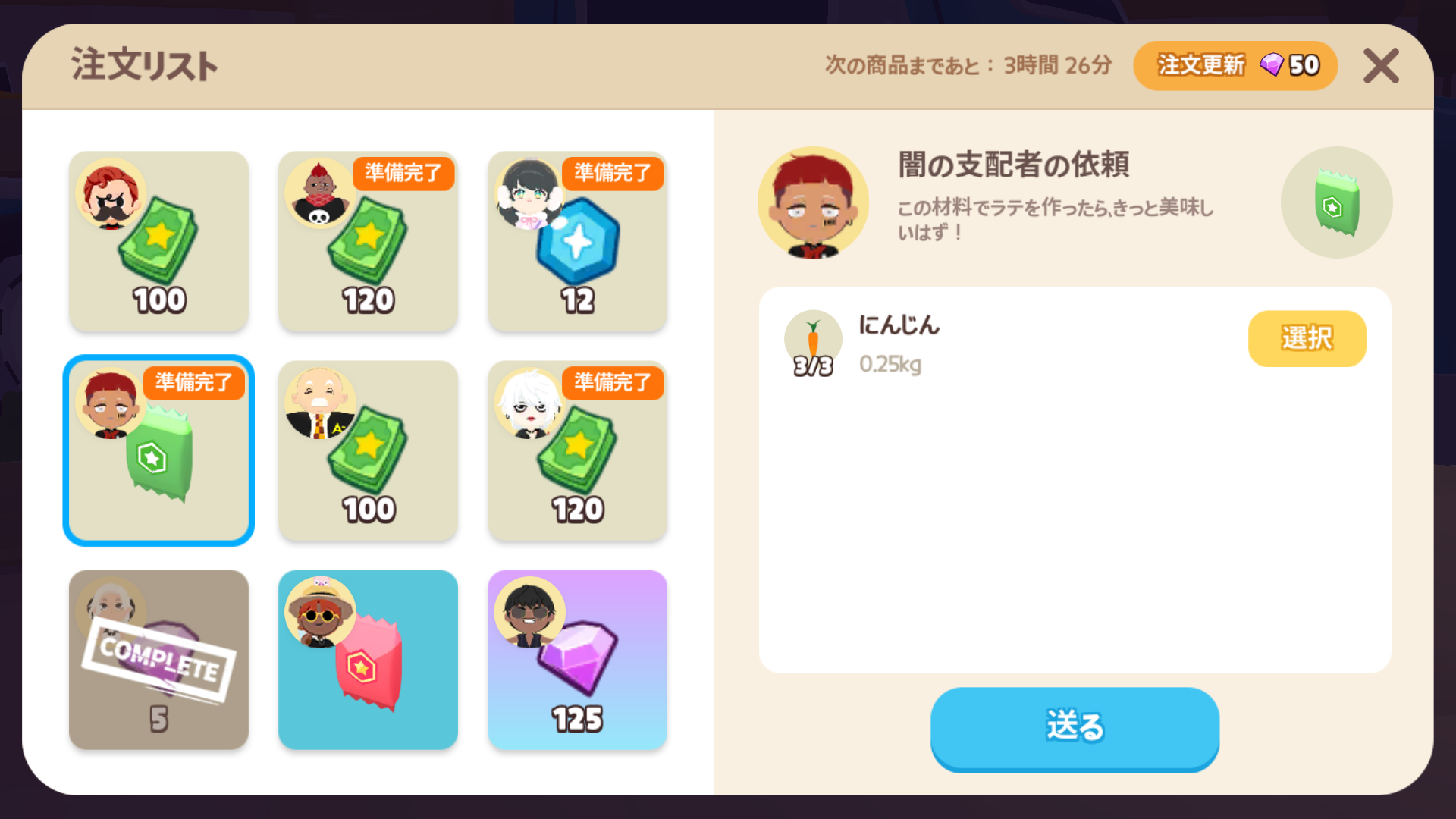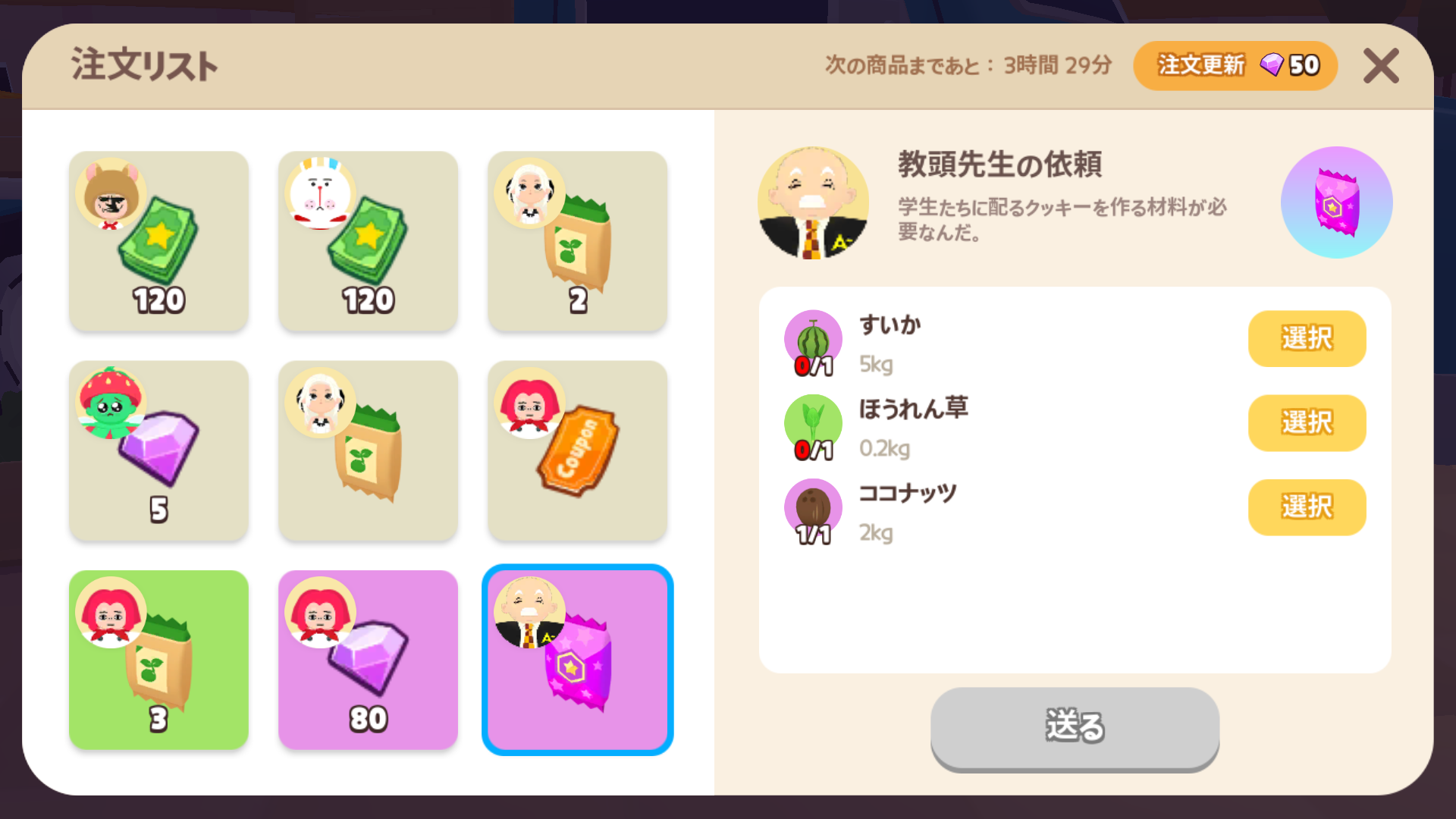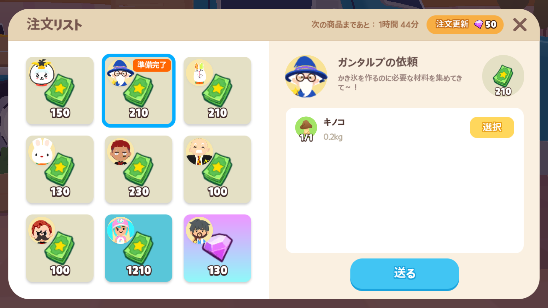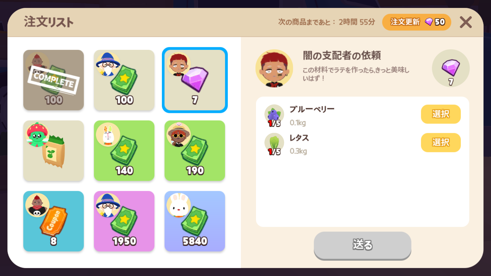 | 注文所 | 4時間 | 50宝石 | 現実時間の 朝9時、13時、17時、21時、未明1時、朝5時 |