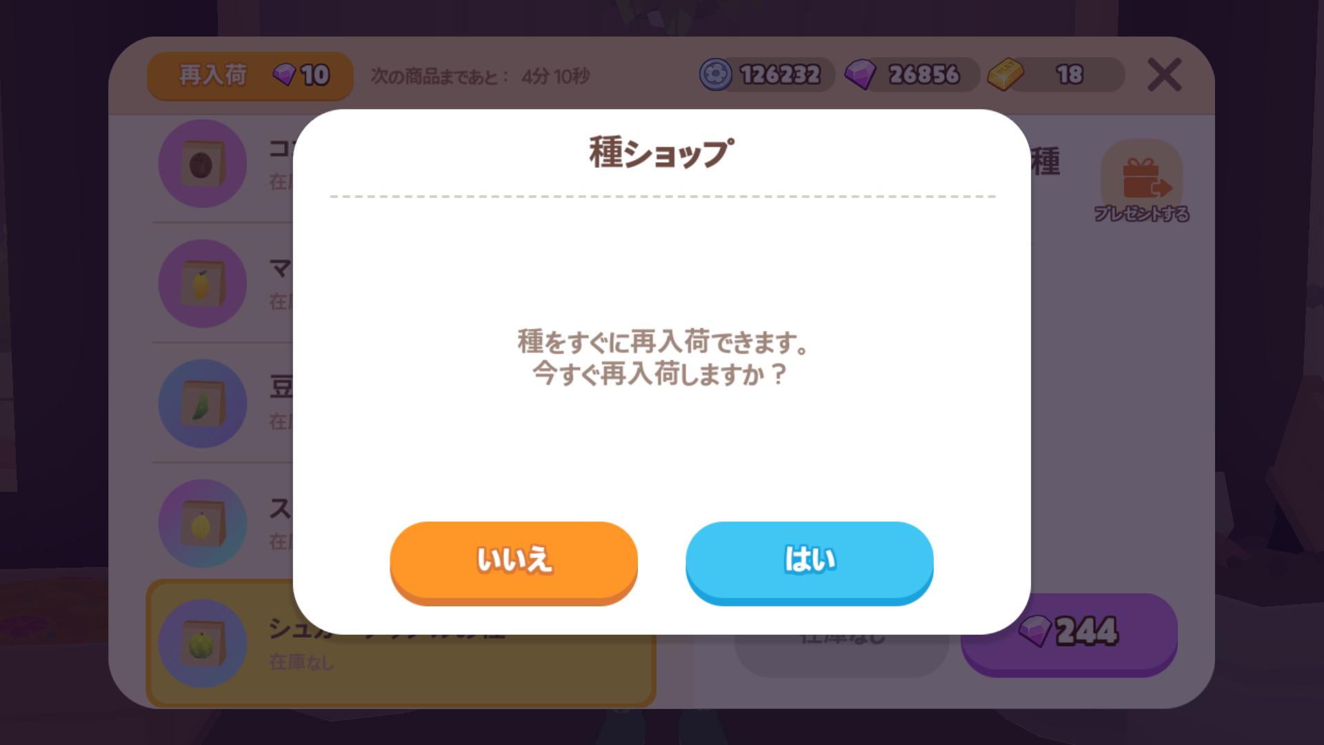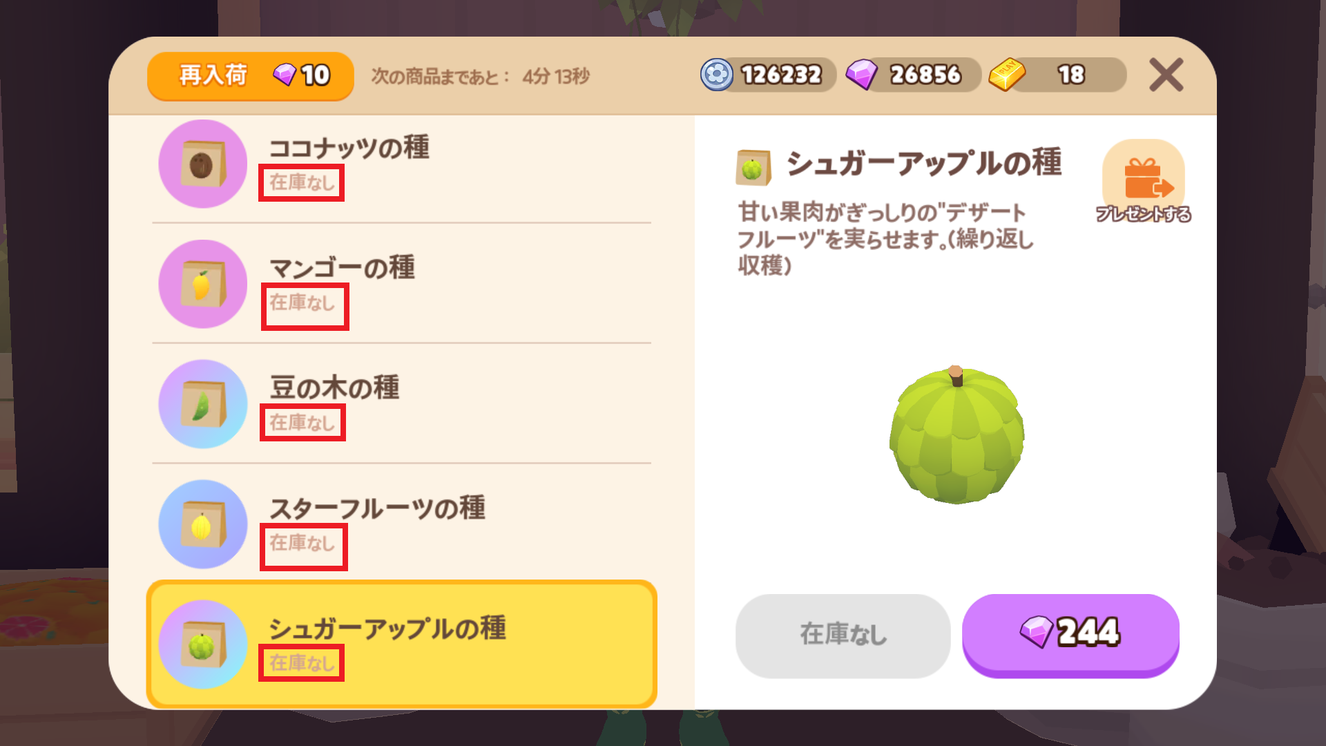 種ショップ | 5分 | 10宝石 | 宝石を使って更新すると、必ず 1つは種の在庫があります。![]() ![]() ![]() |