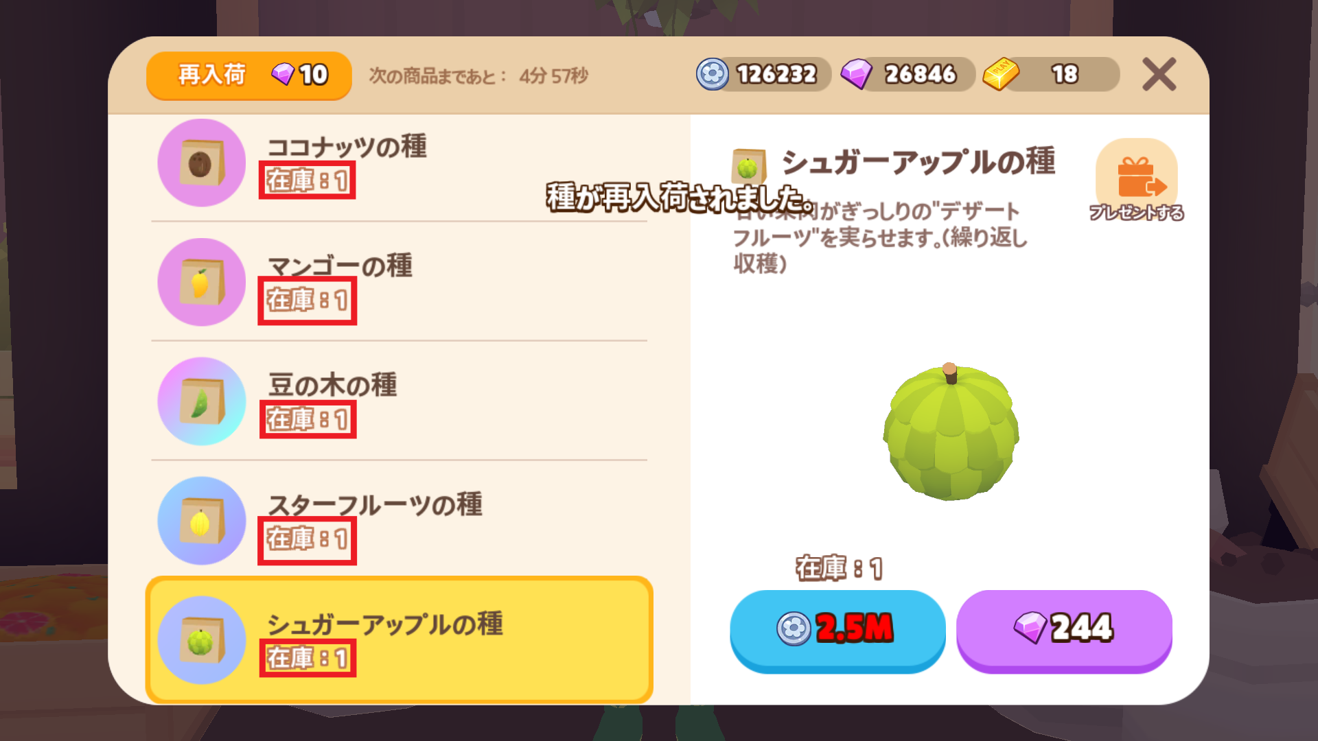 ![]() | シュガーアップル | 2500000 (2.5M) | 244 | ー | 繰り返し |