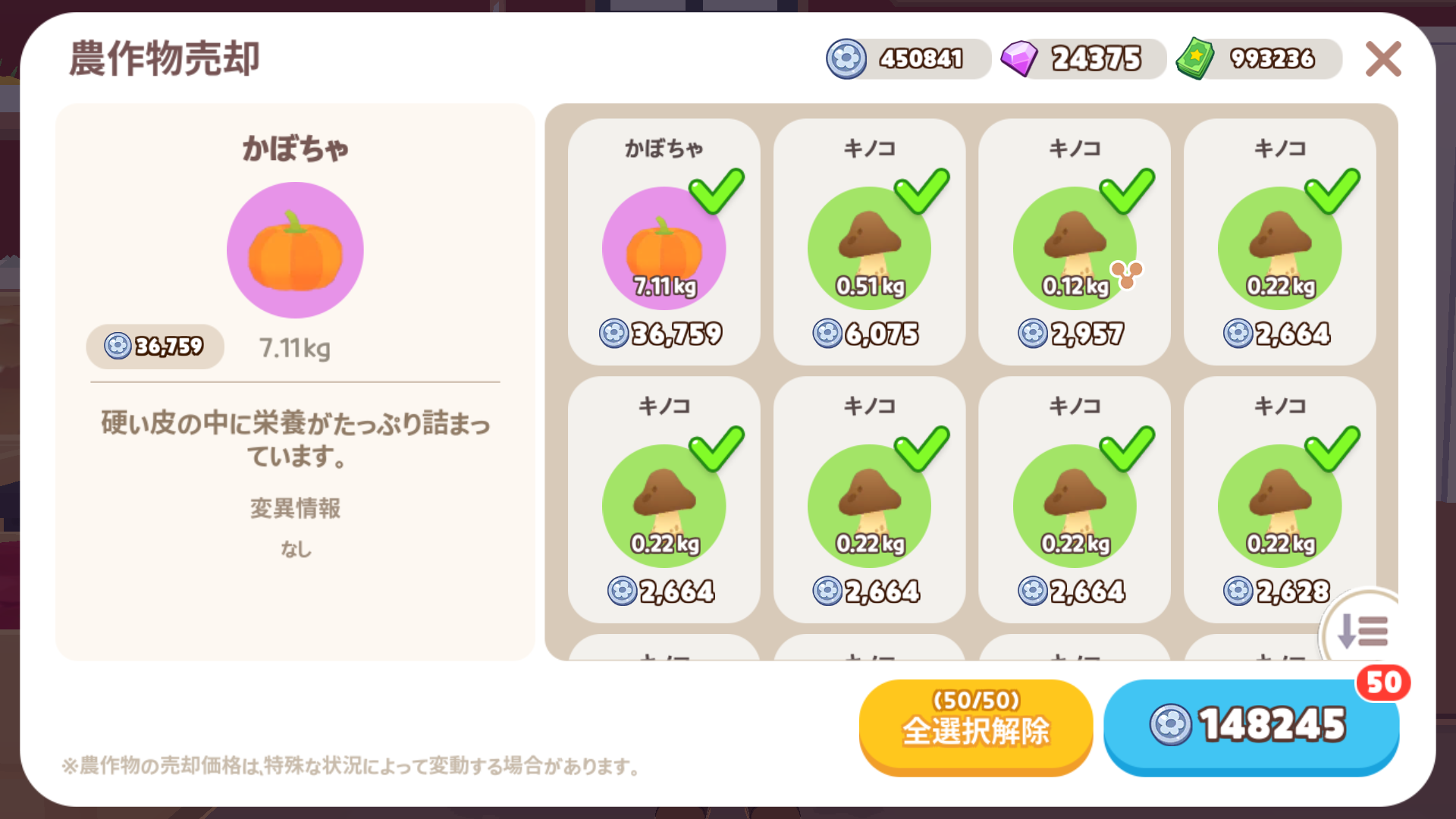 コインが 800枚貯まったら、一度きりの作物「キノコ」を買い、収穫・売却を続けると稼げる速度が上がります。