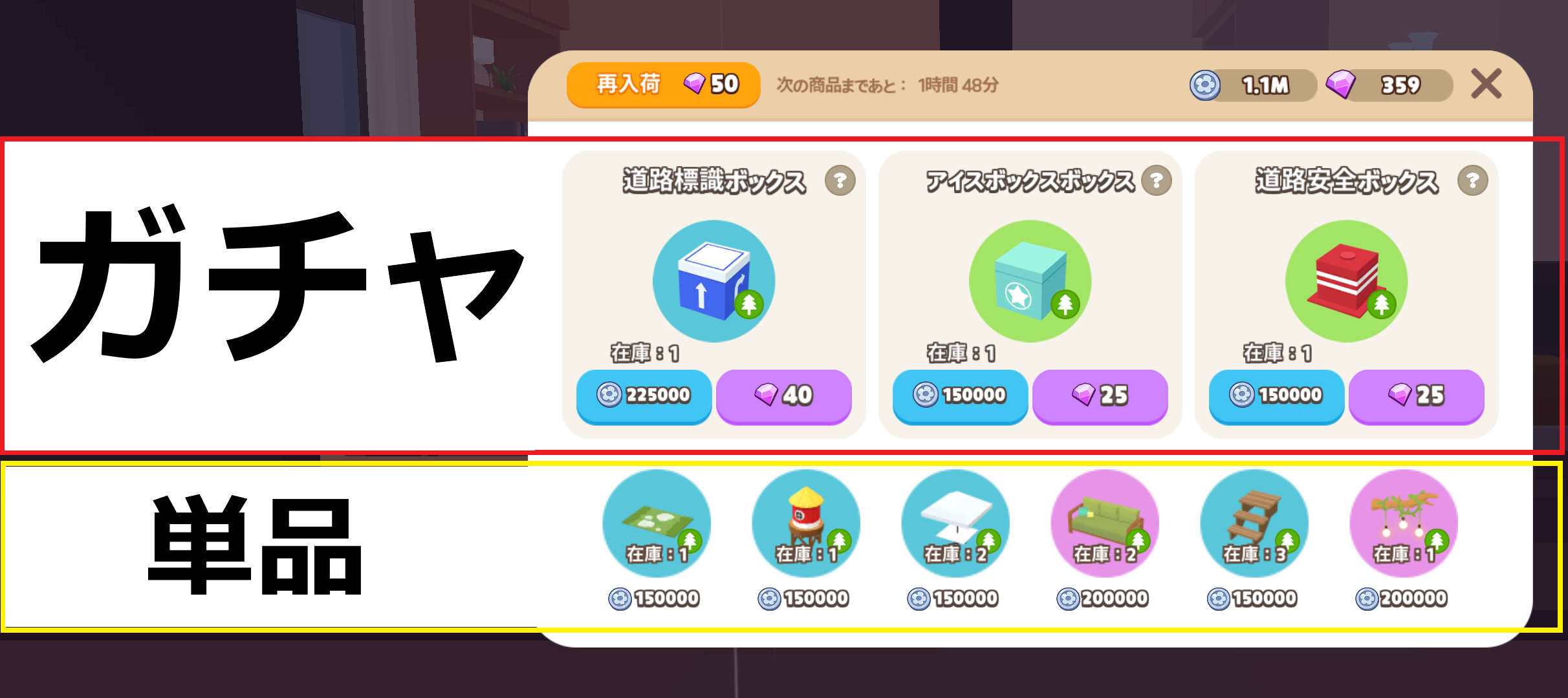 | 農場家具ショップ | 3時間 | 50宝石 | 現実時間の 朝9時、昼12時、15時、18時、21時、夜0時、未明3時、朝6時 |