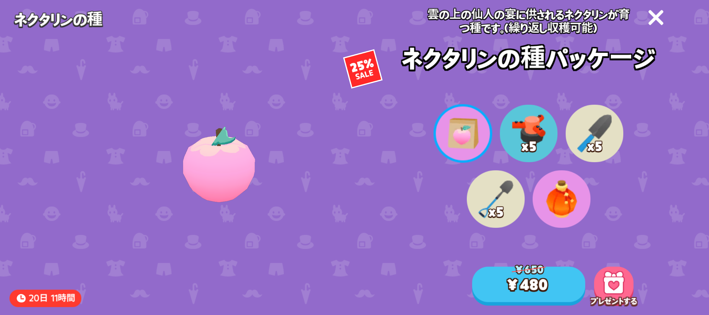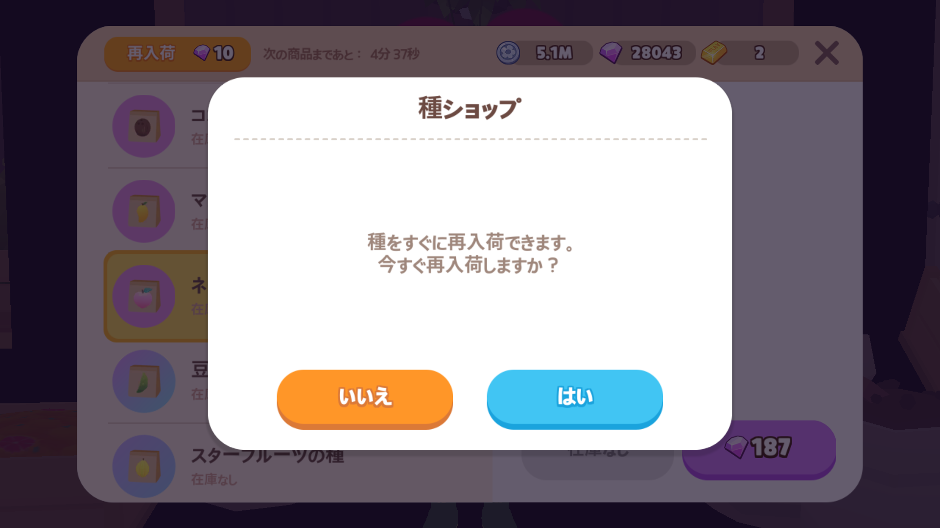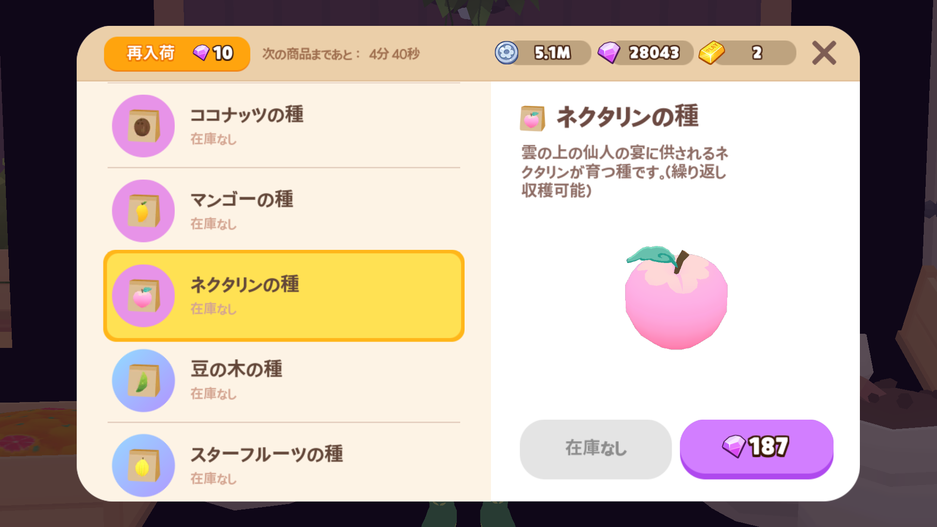 | 種ショップ | 5分 | 10宝石 | 2025年 11月 6日のアップデートから、宝石を使ってもすべての農作物が再入荷されなくなってしまいました。 → → ![]() |