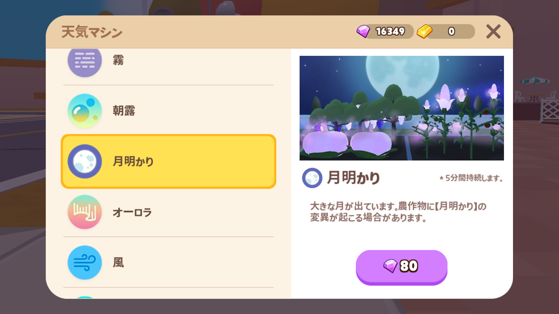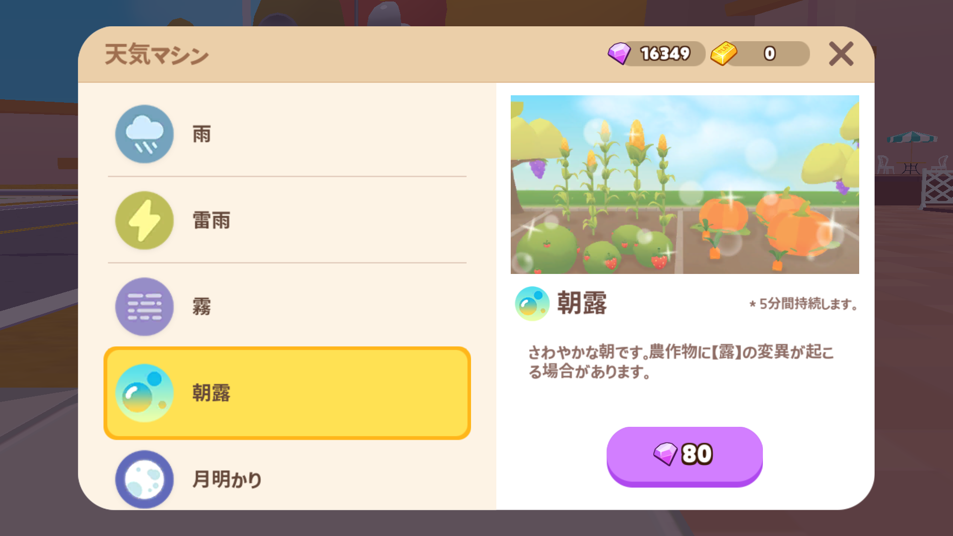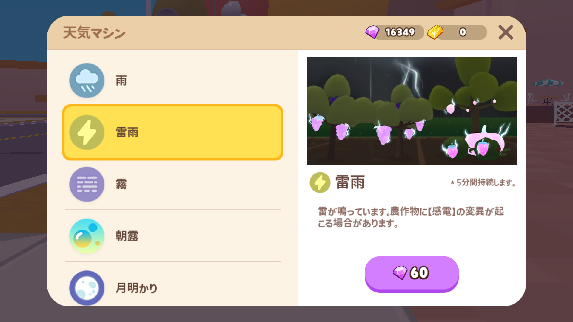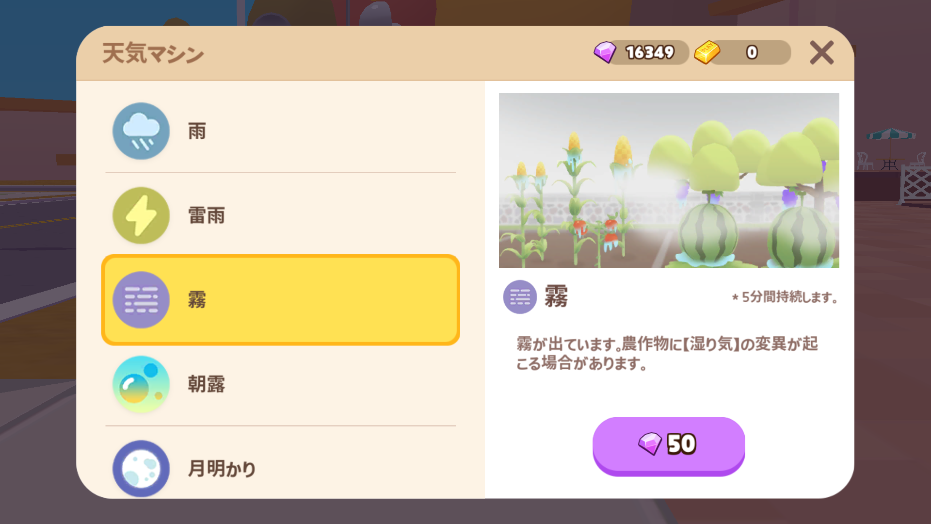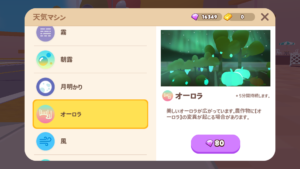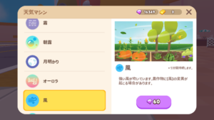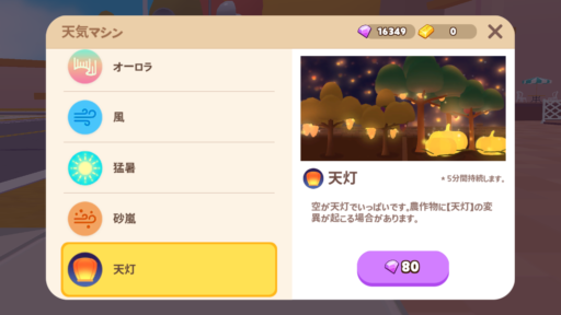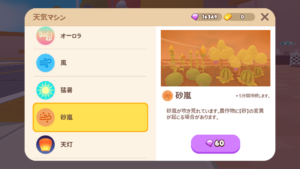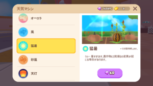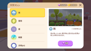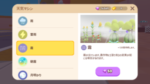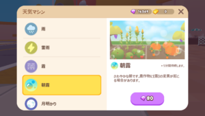 ホームタウンの天候はランダムに変化します。天候が変わっている間、作物の変異が確率的に起きます。また、作物を収穫せずに放置しておけば複数の天候変異がつく可能性が高まります。