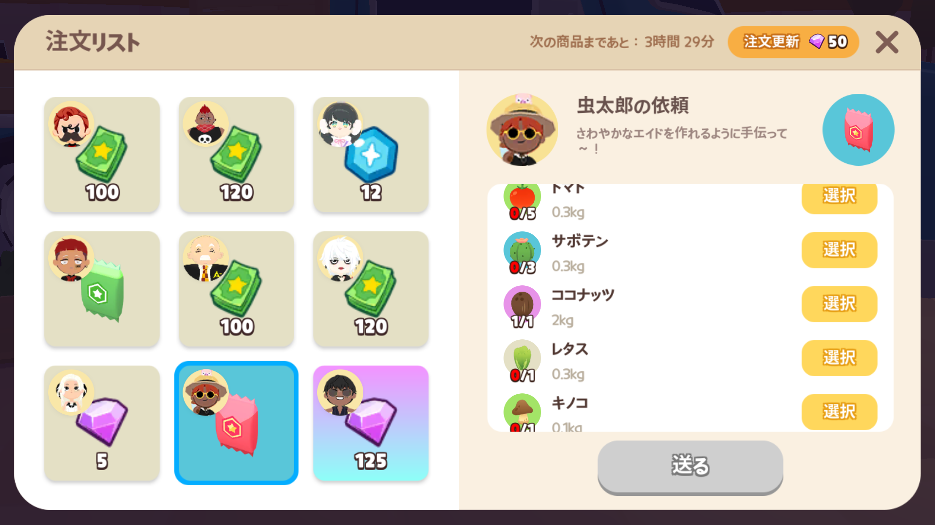 ![]() プレゼントチケット | 10,000 | 1 | 他の人に作物を贈るとき使用 |