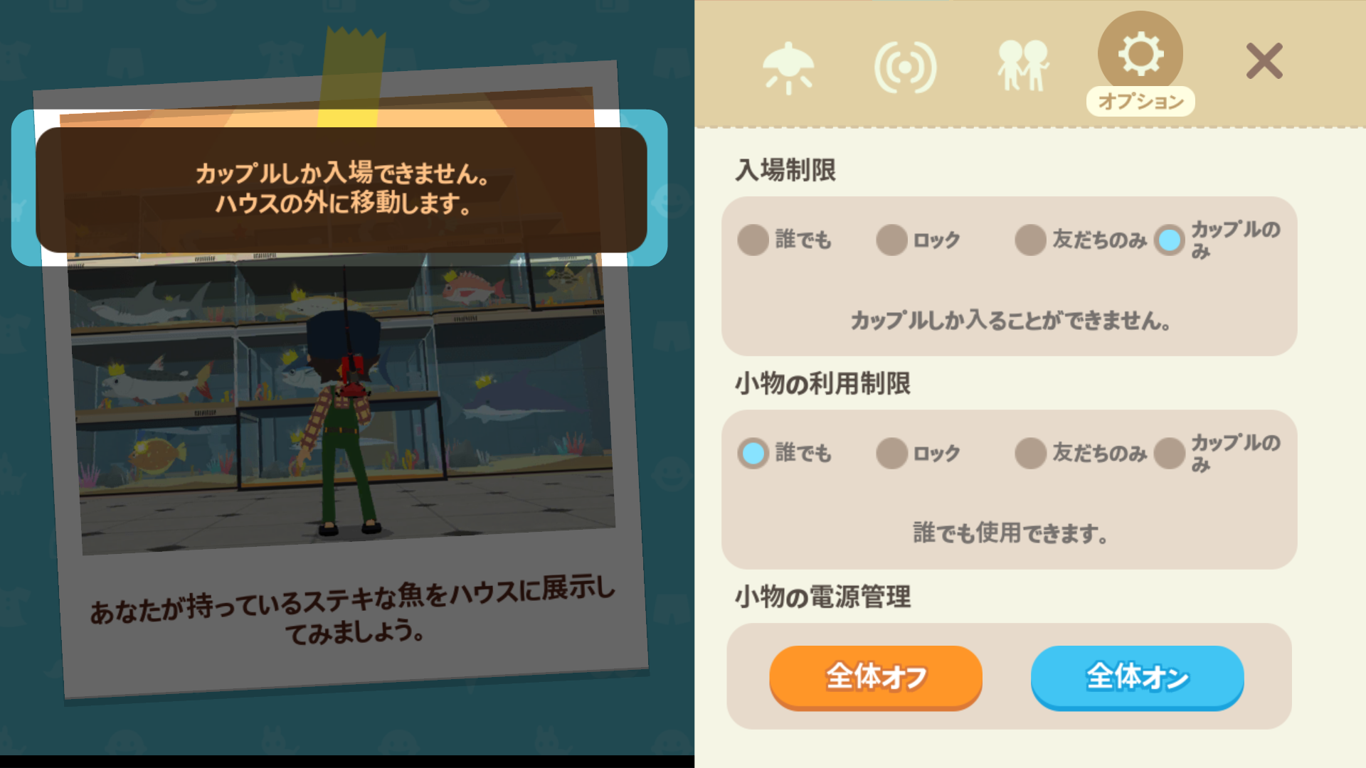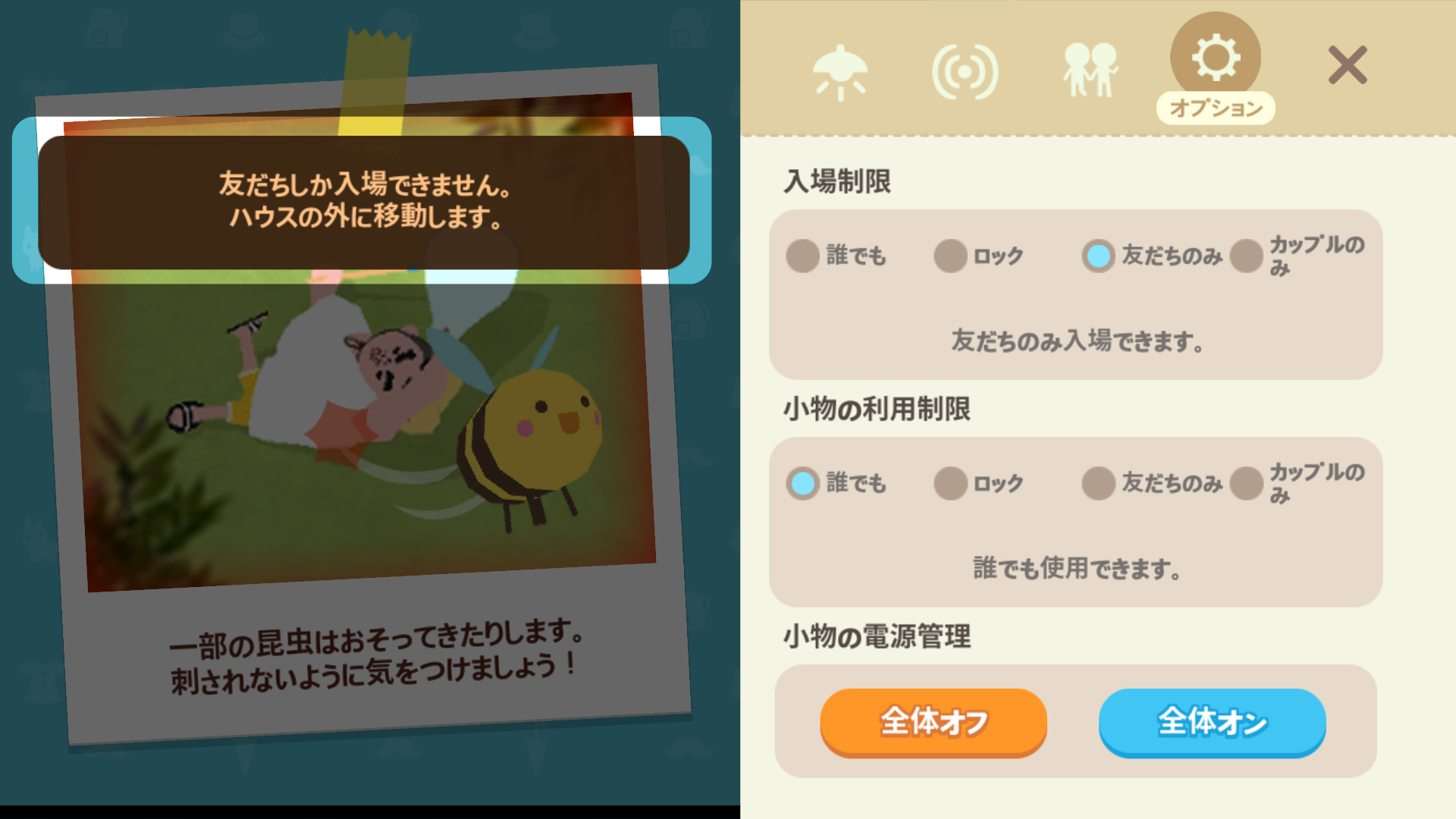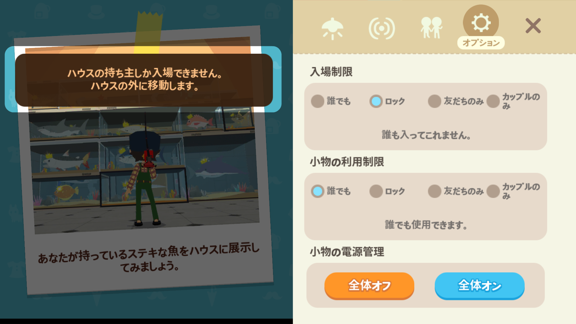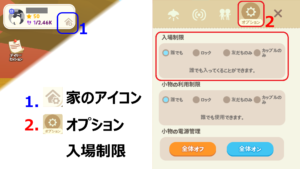 自分の家の入場制限を〝 誰でも 〟以外に設定している場合、ホームパーティに参加できない人がいます。入場制限の確認と変更は、