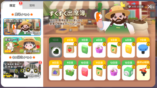現実時間の朝9時以降にログインの上、錠🔒がついていないアイテムをタップすると報酬を受け取れます。