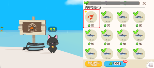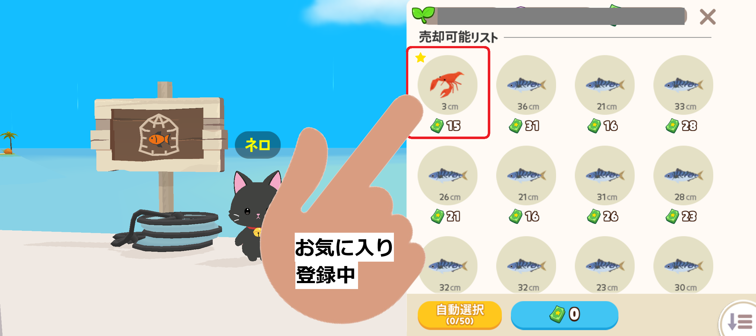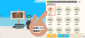 魚を売るとき「自動選択」をしても、お気に入り登録した魚は チェック✔ がつかなくなりました。