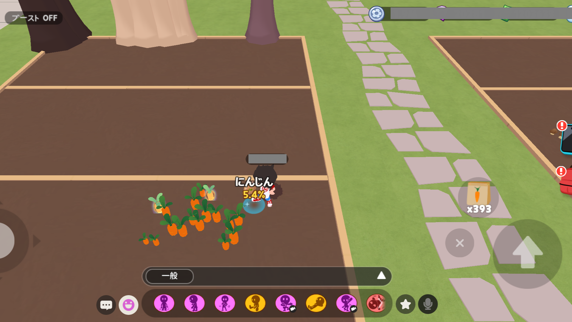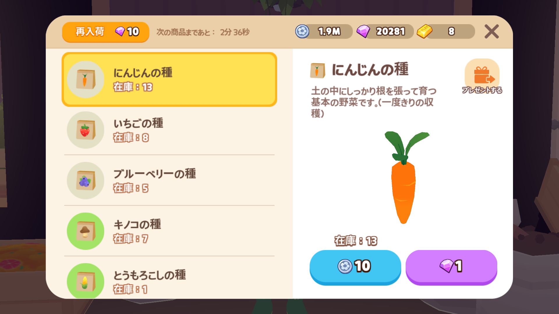 • 農場で「にんじんの種」を買い、種をまいて育てます。種まきから収穫まで 20秒かかります。