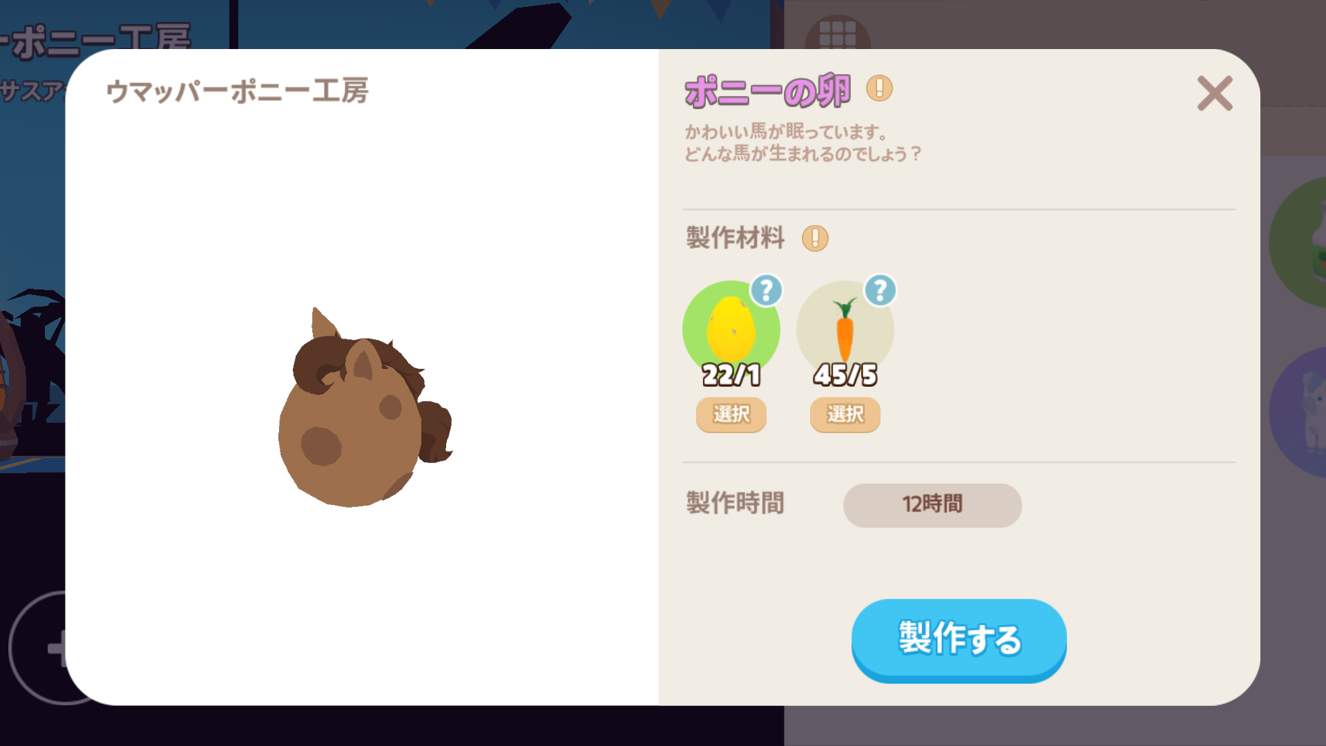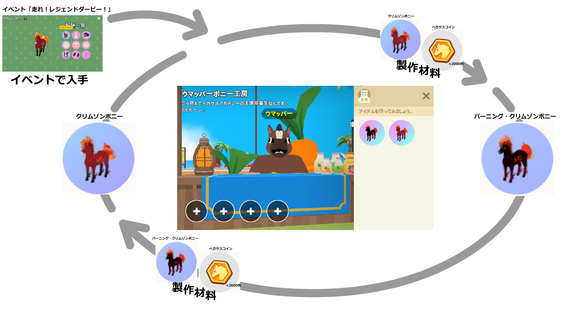 • イベントで入手したクリムゾンポニー、ペガサスコイン2000枚を使いウマッパー工房で製作します。