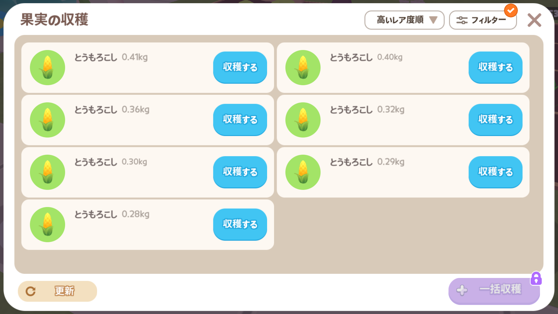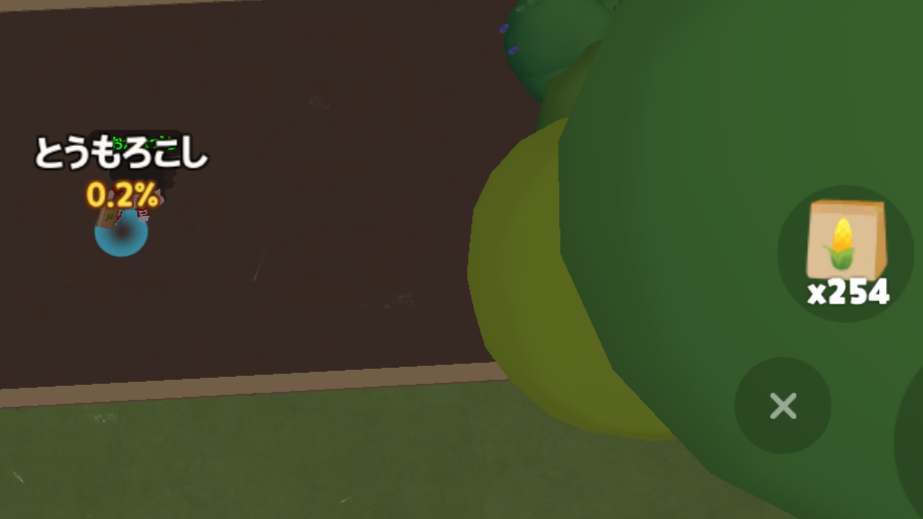 • にんじんと同じく、農場で「とうもろこしの種」を買い、種をまいて育てます。種まきから、とうもろこしの葉や茎が育つまで2時間くらい、そのあと作物が実って収穫できるまで 20分くらいかかります。
