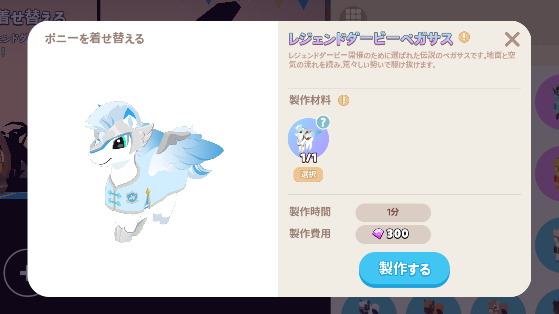 すでに通常の合成をしているポニーは、ウマッパー工房でレジェンドダービーの衣装に着せ替えられます。
