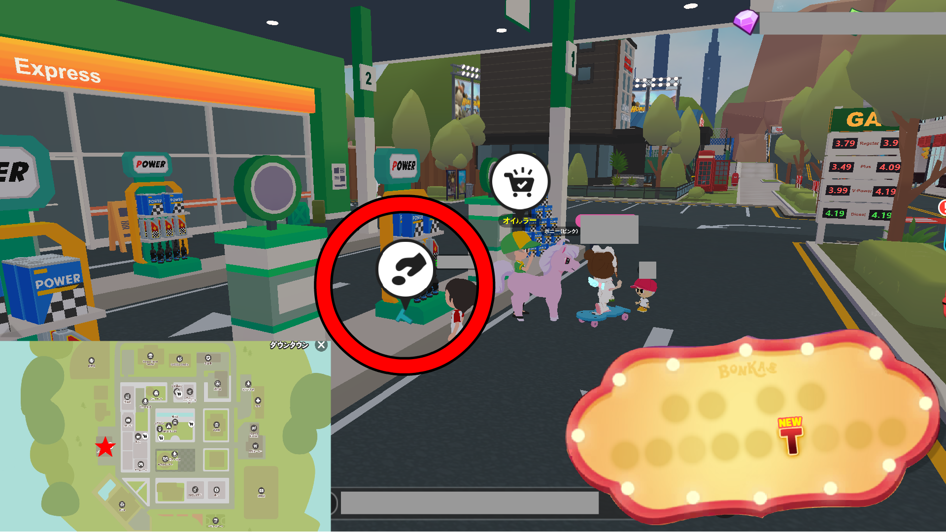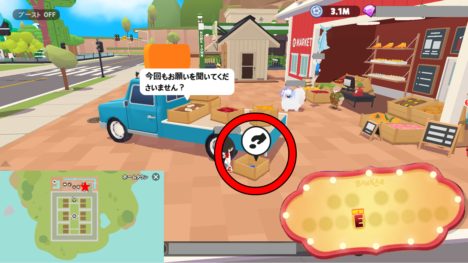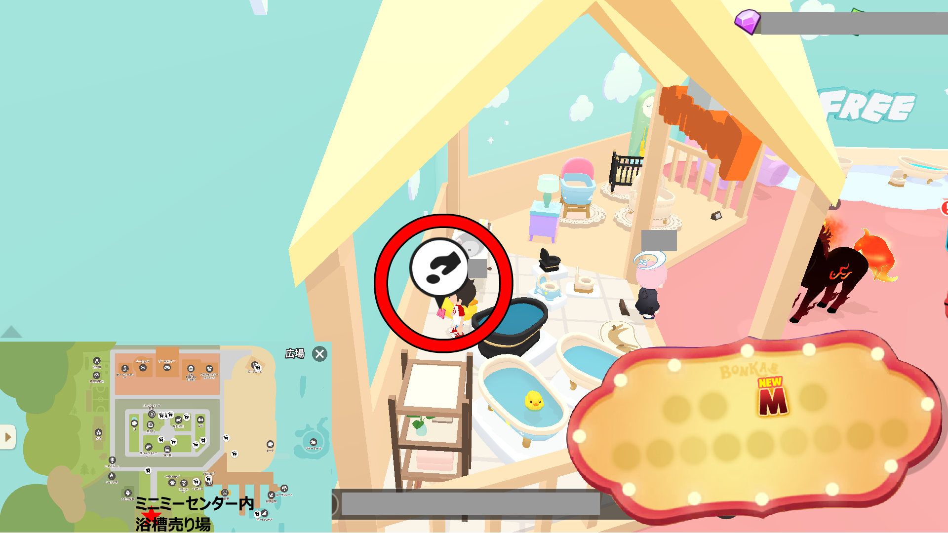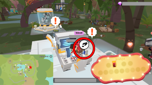 • 木の枝:落ちている物を拾ったり、NPC「的屋あたる」から買えます。的屋あたるは、ウマッパーの右後ろにいます。