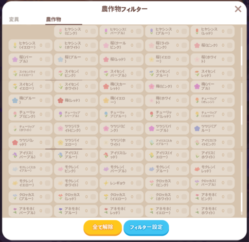 種ショップや課金で買える花の色は「ホワイト」、「イエロー」、「レッド」の三色です。花の種を沢山まくと、ほかの色が出現する場合があります。出現確率や組み合わせは調査中です。
