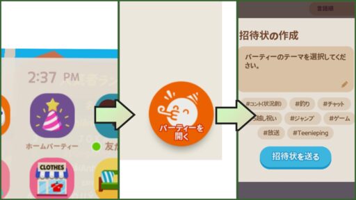 スマホのホームパーティ➡パーティを開く➡テーマを選択➡招待状を送る